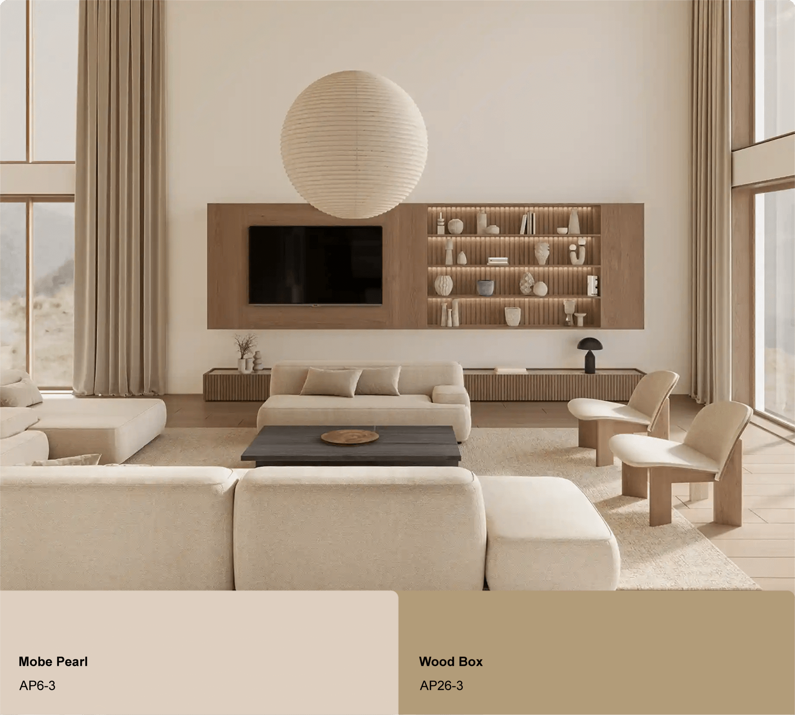 Warna Netral Hangat (Hangat Putih, Beige, Krem) menjadi pondasi utama gaya natural minimalis. Pilih cat tembok / cat dinding seperti Danabright atau Danacryl Sheen & Matt untuk tampilan interior premium untuk dinding utama.