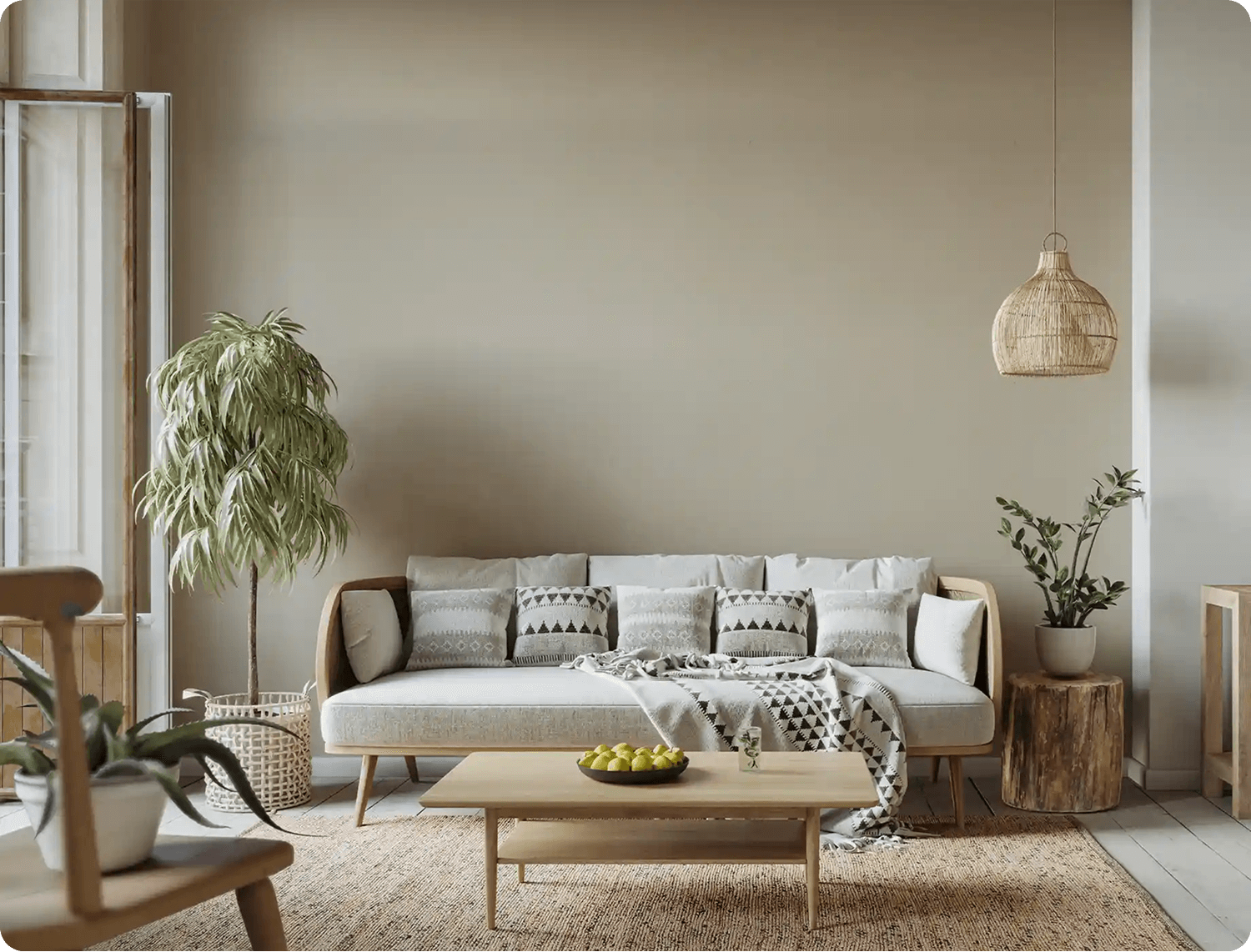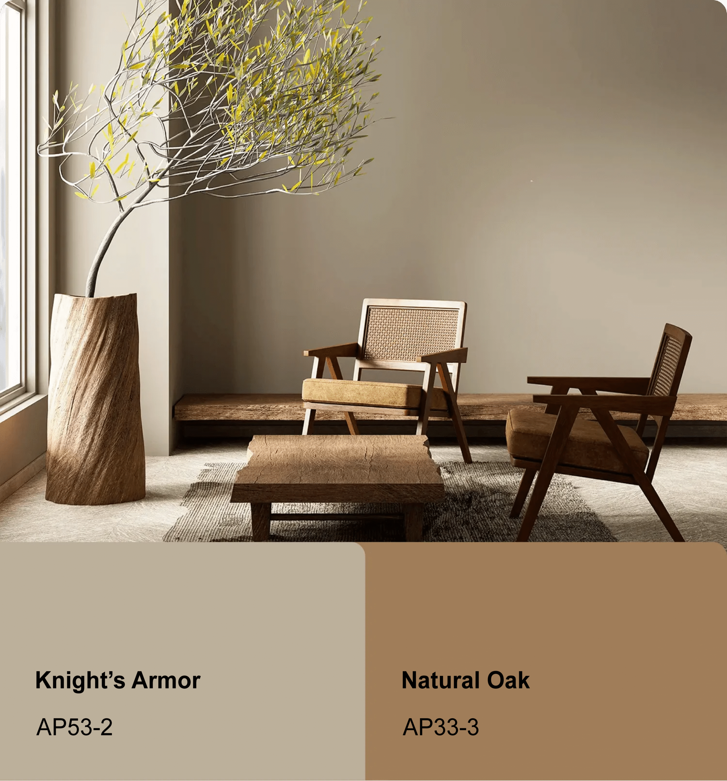 Jika Anda ingin membawa kesegaran alam ke dalam rumah, inspirasi warna cat ini adalah pilihan yang tepat. Konsep ini menggabungkan warna-warna netral yang tenang dengan sentuhan warna hijau yang hidup dan menyegarkan. Kombinasi warna cat ini ideal untuk menciptakan ruangan yang modern, ceria, namun tetap relaks.