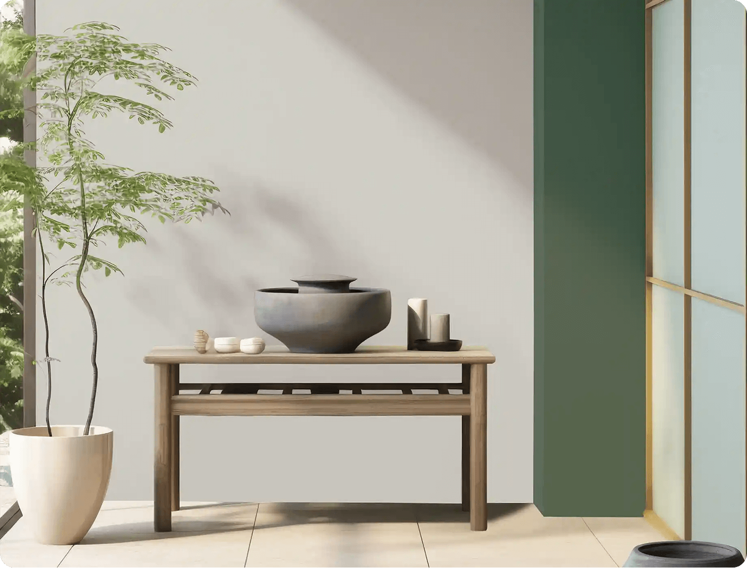 Jika Anda ingin membawa kesegaran alam ke dalam rumah, inspirasi warna cat ini adalah pilihan yang tepat. Konsep ini menggabungkan warna-warna netral yang tenang dengan sentuhan warna hijau yang hidup dan menyegarkan. Kombinasi warna cat ini ideal untuk menciptakan ruangan yang modern, ceria, namun tetap relaks.