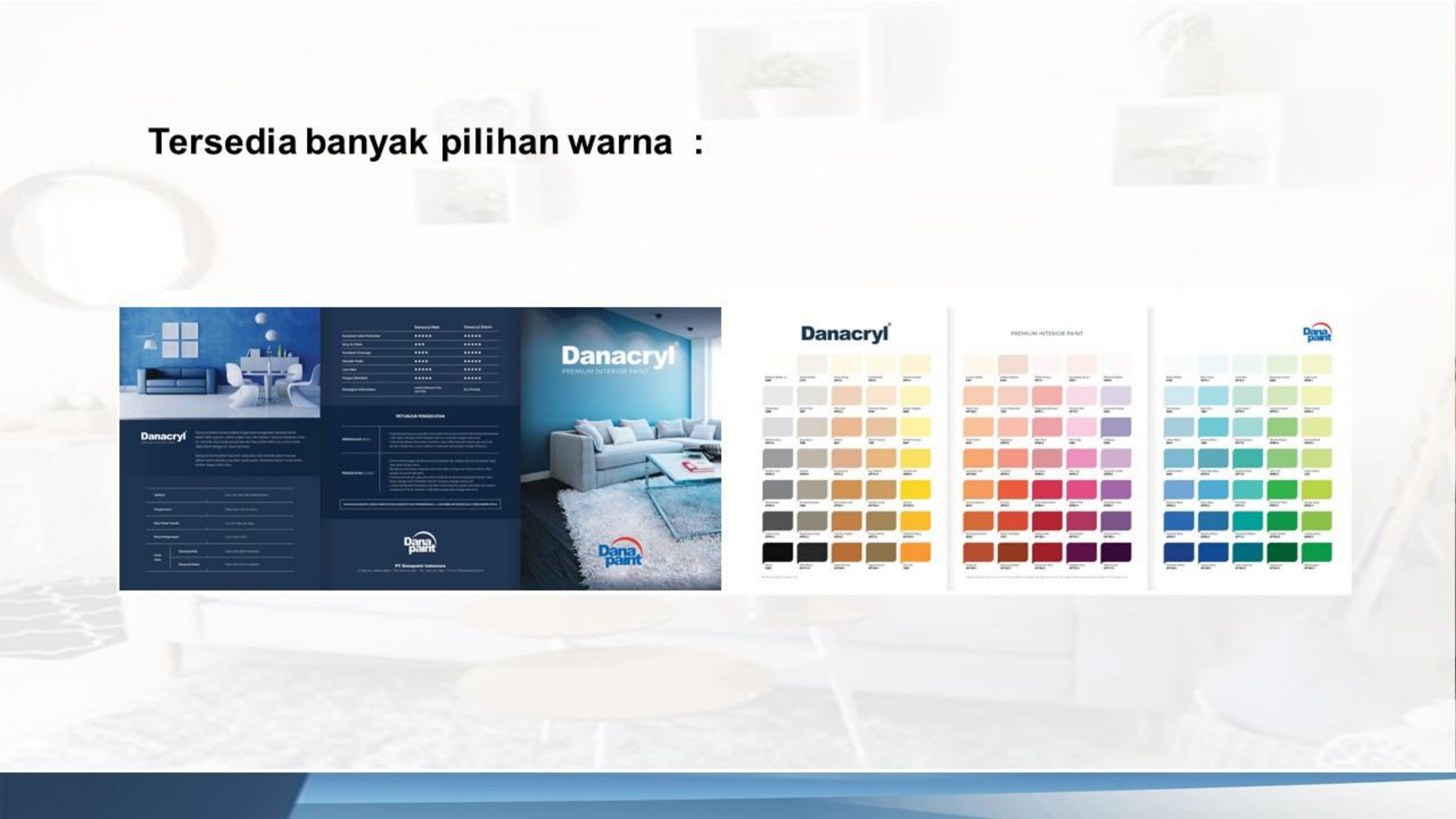 Danabrite tersedia dalam banyak pilihan warna yang cerah dan tahan lama untuk memperindah interior rumah.Â